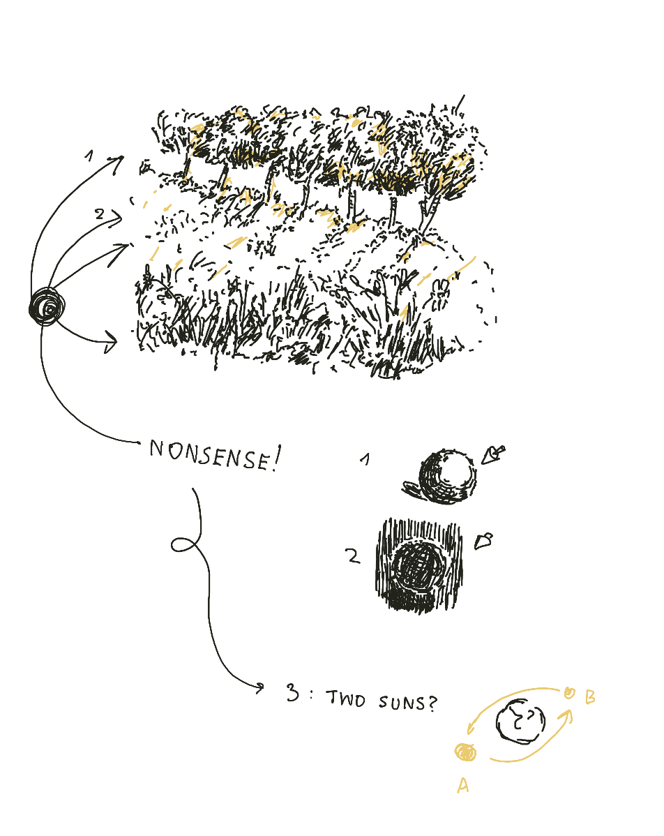 Things I've learned by studying my less weird drawings: I have a deeply ingrained belief that there are two suns (or, I keep forgetting how to place the shadows)